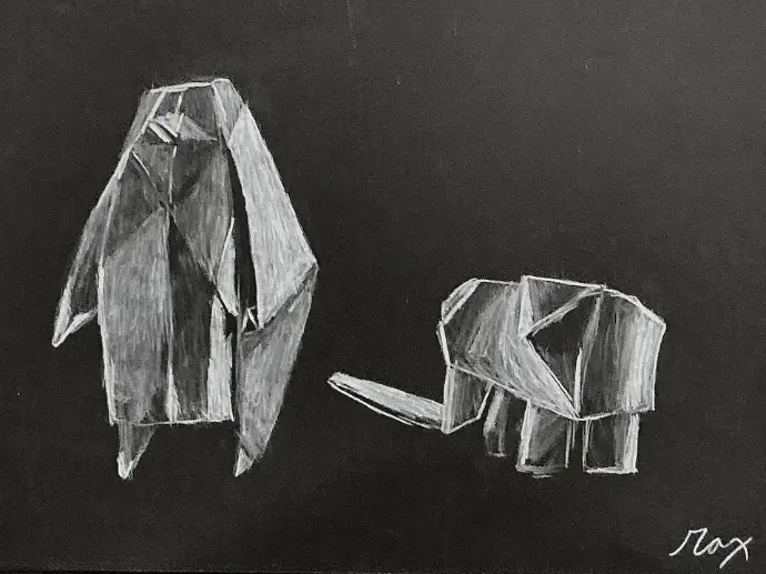Ce projet avait le but de créer deux origamis de sujets vivants afin de les dessiner avec crayon blanc sur papier noir. On mettait l'accent sur la nuance des gris et surtout la qualité d'ombrage.