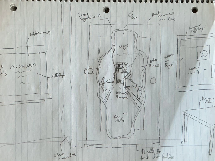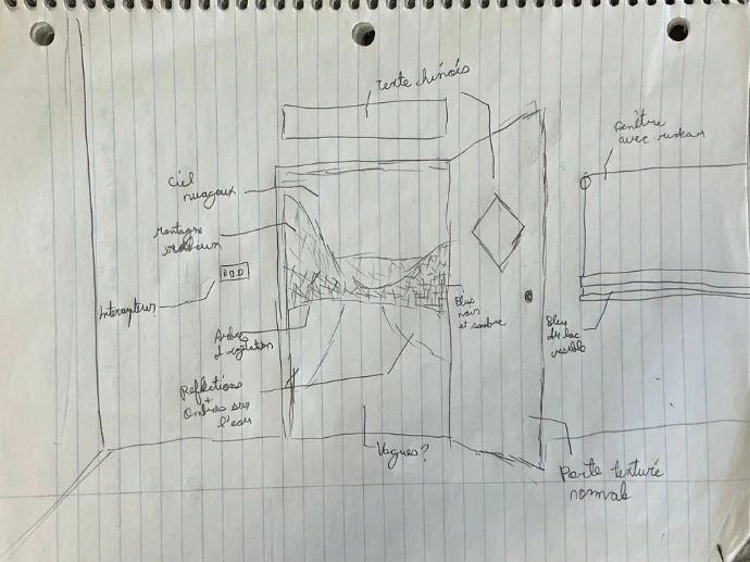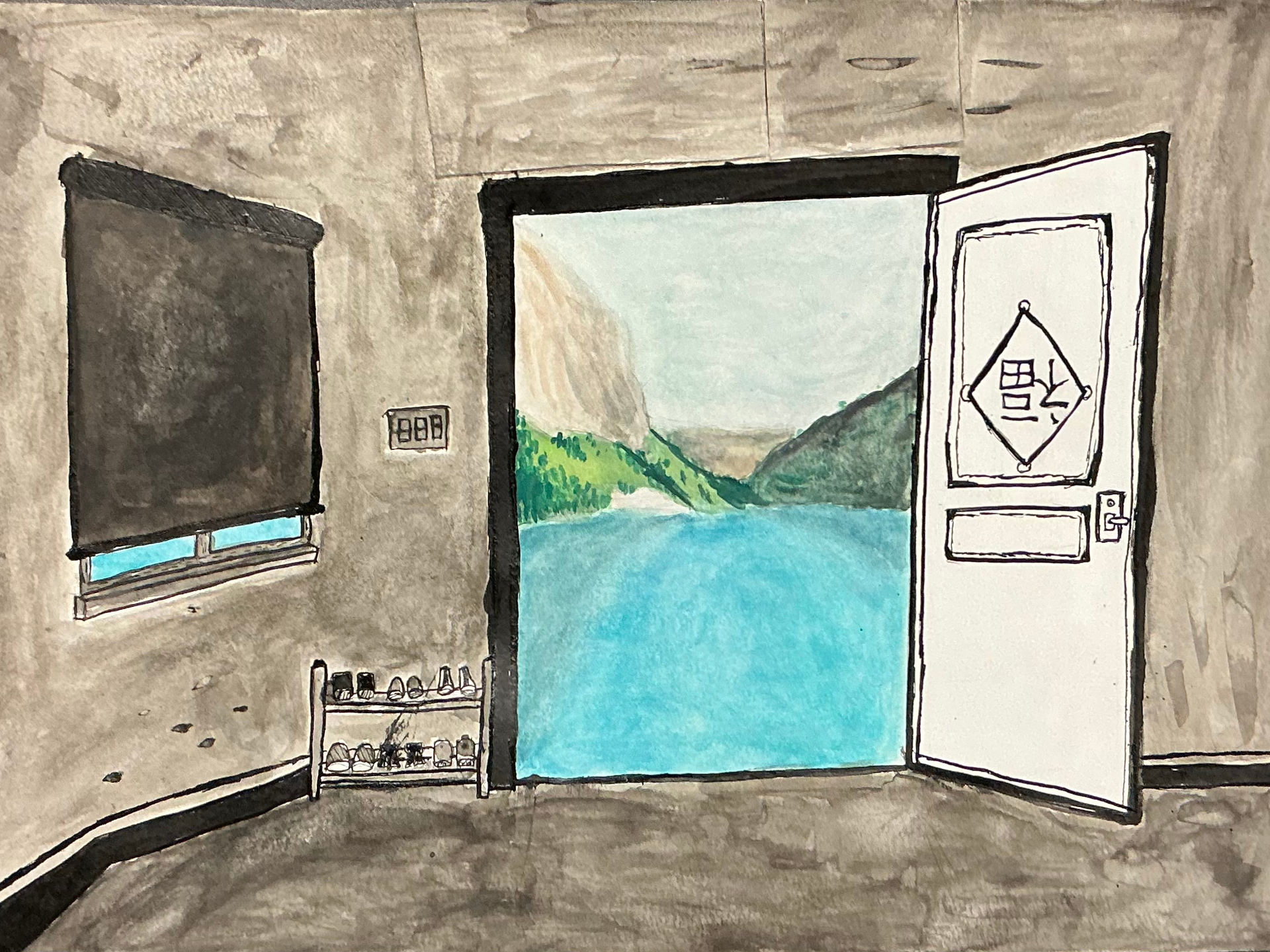 Ce projet avait le but de réaliser une composition qui juxtapose un espace intérieur en encre et un monde « d'au-delà » en aquarelle, ouvert par une porte. On mettait l’accent surtout sur la cohérence et l’atmosphère créé par ces deux éléments et la technique d’aquarelle (mélanges, dilution, superposition, texture, etc) et d'encrage (textures, ombres, etc).